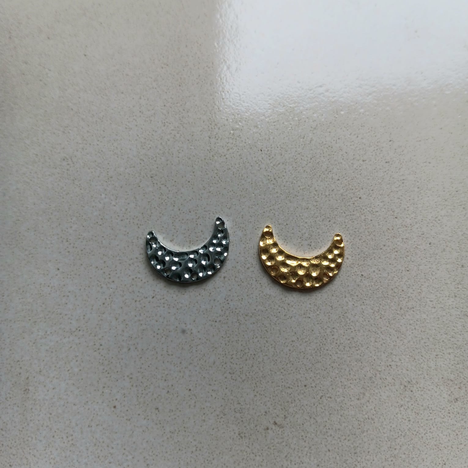 Apportez une touche moderne et graphique à vos bijoux fantaisie avec ce connecteur chandelier demi-lune martelé en métal. Sa forme géométrique élégante et sa texture martelée lui donnent un style unique, parfait pour des créations à la fois contemporaines et originales. Compact mais très décoratif, il dispose de 5 trous d'attache pour y suspendre des chaînes, des perles ou des pampilles selon vos envies. Que ce soit pour des boucles d’oreilles pendantes, un pendentif central ou un élément décoratif sur un bracelet, ce connecteur s’intègre facilement dans vos créations DIY.